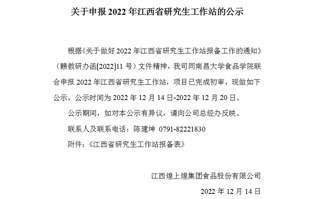 根據(jù)《關(guān)于做好2022年江西省研究生工作站報備工作的通知》(贛教研辦函[2022]11號)文件精神,我司同南昌大學(xué)食品學(xué)院聯(lián)合申報2022年江西省...