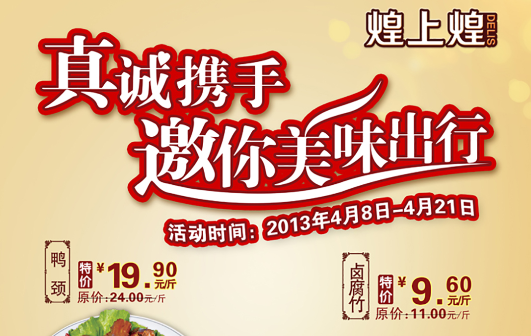 活動時間:2013年4月8日-4月21日活動內(nèi)容:鴨脖特價19.9元/斤(原價24元/斤),鹵腐竹特價9.6元/...